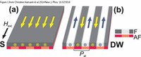 Структура образца и состояние намагниченности в насыщенном состоянии S (a) и в нулевом магнитном поле, прикладываемом антипараллельно состоянию доменных границ (b). Предполагаемые направления намагниченности и положение границ Нееля изображены схематически.
