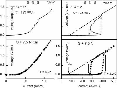 Решена задача об описании экспериментальных вольт-амперных характеристик (ВАХ) слабосвязанных сверхпроводников. Традиционно она решалась с использованием называемой RSJ модели зашунтированного джозефсоновского перехода, не имеющей в своей основе четкого физического смысла. Недавно была сформулирована теория этих систем, впервые учитывающая андреевское отражение носителей сверхтока на границе слабой связи. Нами целенаправленно была поставлена серия экспериментов по проверке ее применимости, в ходе которой электросопротивление материала слабой связи вежду высокотемпературными сверхпроводниками (ВТСП) изменялось почти в 40 раз. При этом экспериментальные ВАХ таких слабосвязанных ВТСП изменились не только количественно, но и качественно, как показано на рисунке. В то же время данная теория позволила описать эти ВАХ в рамках единого подхода, что сделано для ВТСП впервые.