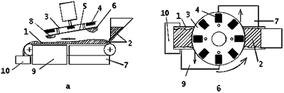 Над лентой транспортера 1 с сепарируемым материалом 2 вращается диск 3 с постоянными магнитами 4 ( Nd-Fe-B ) с чередующейся магнитной полярностью и разгрузочным диском 5. При приближении сепарируемого продукта к магнитной системе под действием знакопеременного магнитного поля происходит разрушение магнитных флокул. Мономинеральные магнитные частицы притягиваются к нижней поверхности диска 6 и центробежной силой отбрасываются в бункер 7. Оставшиеся на транспортере частицы с более низкой удельной магнитной восприимчивостью притягиваются к про-тивоположной стороне диска 8 и отбрасываютя в бункер 9, а немагнитная фракция поступает в бункер 10. Изменяя наклон вращающейся магнитной системы, ее расстояние до транспортера, а также расстояние между магнитами и разгрузочным диском появляется возможность получать суперконцентраты, разделять тонкодисперсные порошковые материалы на составляющие магнитные фракции с высокой степенью селективности.