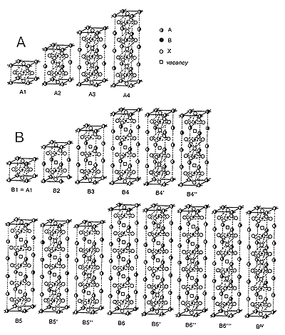 During the last few years, the authors tried to analyze the published structural data concerning perovskites, their deficient versions, PL-polytypes and layered PL-structures. The main aims of the work have been an effort to find the general scheme of architecture for the stoichiometric, anion- and cation-deficient PL-crystals and to determine the interrelations between different types of PL-structures. It was shown recently [1, 2] that the structures of the all known PL-crystals can be considered as the systems of slabs containing n layers (n = 1, 2, …,?) vertice-linked octahedra BX6 (O), pyramids BX5 (P) and/or square nets BX4 (Q) intergrowing by their outer surfaces with blocks of different types when the layered PL-structures are formed.