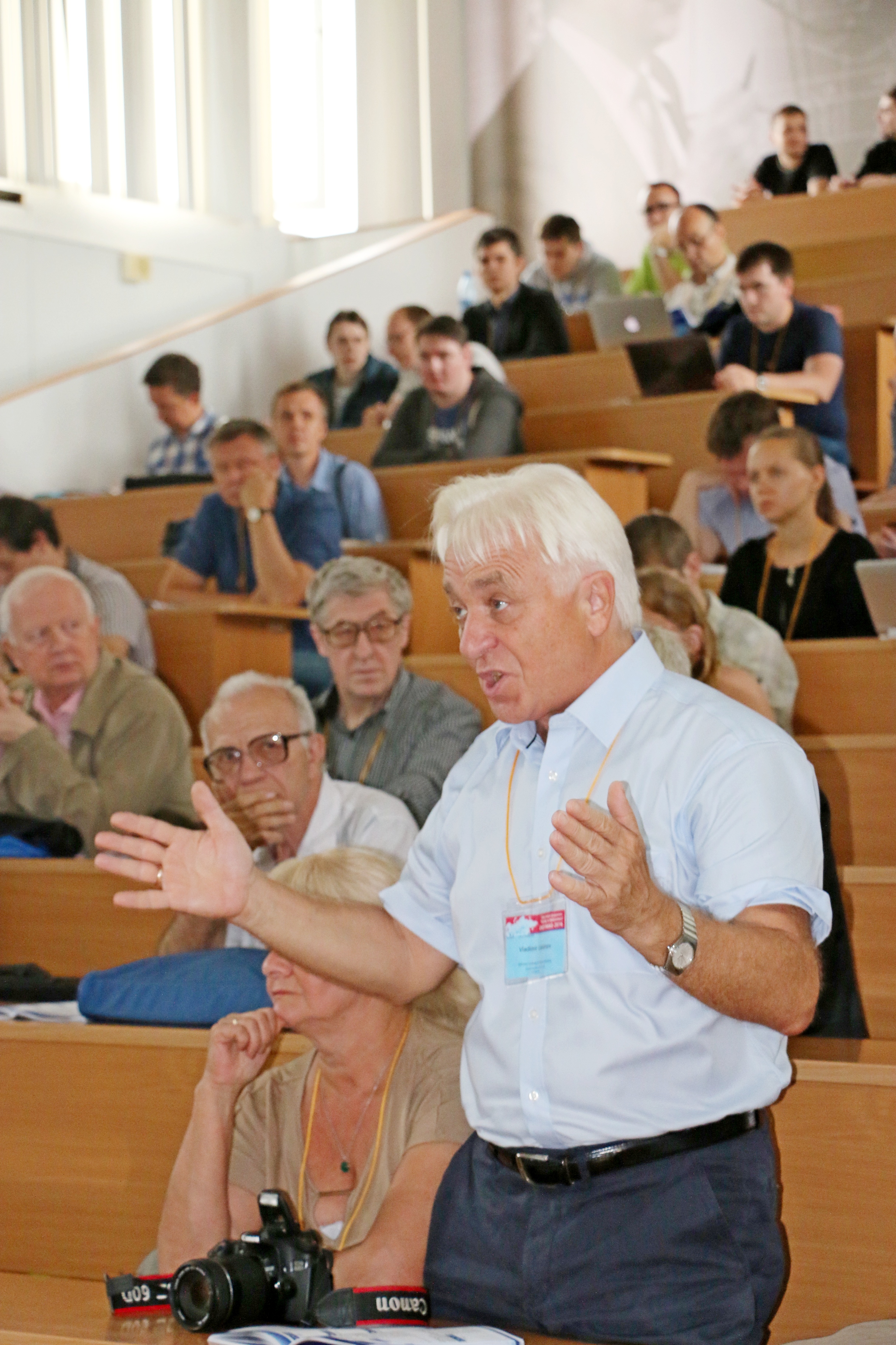 Академик РАН Владимир Васильевич Устинов, директор Института физики металлов им. М.Н. Михеева Уральского отделения Российской академии наук (УрО РАН) за обсуждением устных докладов на научном форуме EASTMAG-016, Красноярск.