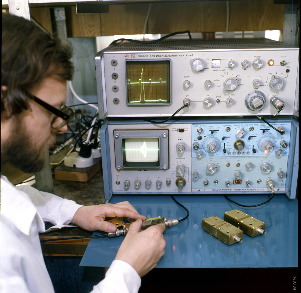1982 год. Вершинин Владимир Васильевич, сотрудник лаборатория физики магнитных пленок Института физики им. Л.В. Киренского Сибирского отделения Академии наук СССР, за установкой по измерению амплитудно-частотных характеристик. Красноярск.