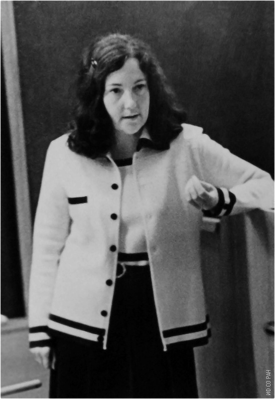 Александрова И.П., старший научный сотрудник лаборатории кристаллофизики Института физики им. Л.В. Киренского Сибирского отделения Академии наук СССР (ИФ СО АН СССР). Выступление на I-ом Советско-Японском симпозиуме по сегнетоэлектричеству, посвященном физическим основам применения сегнетоэлектриков в оптоэлектронике. Новосибирск, Академгородок 1976 год.