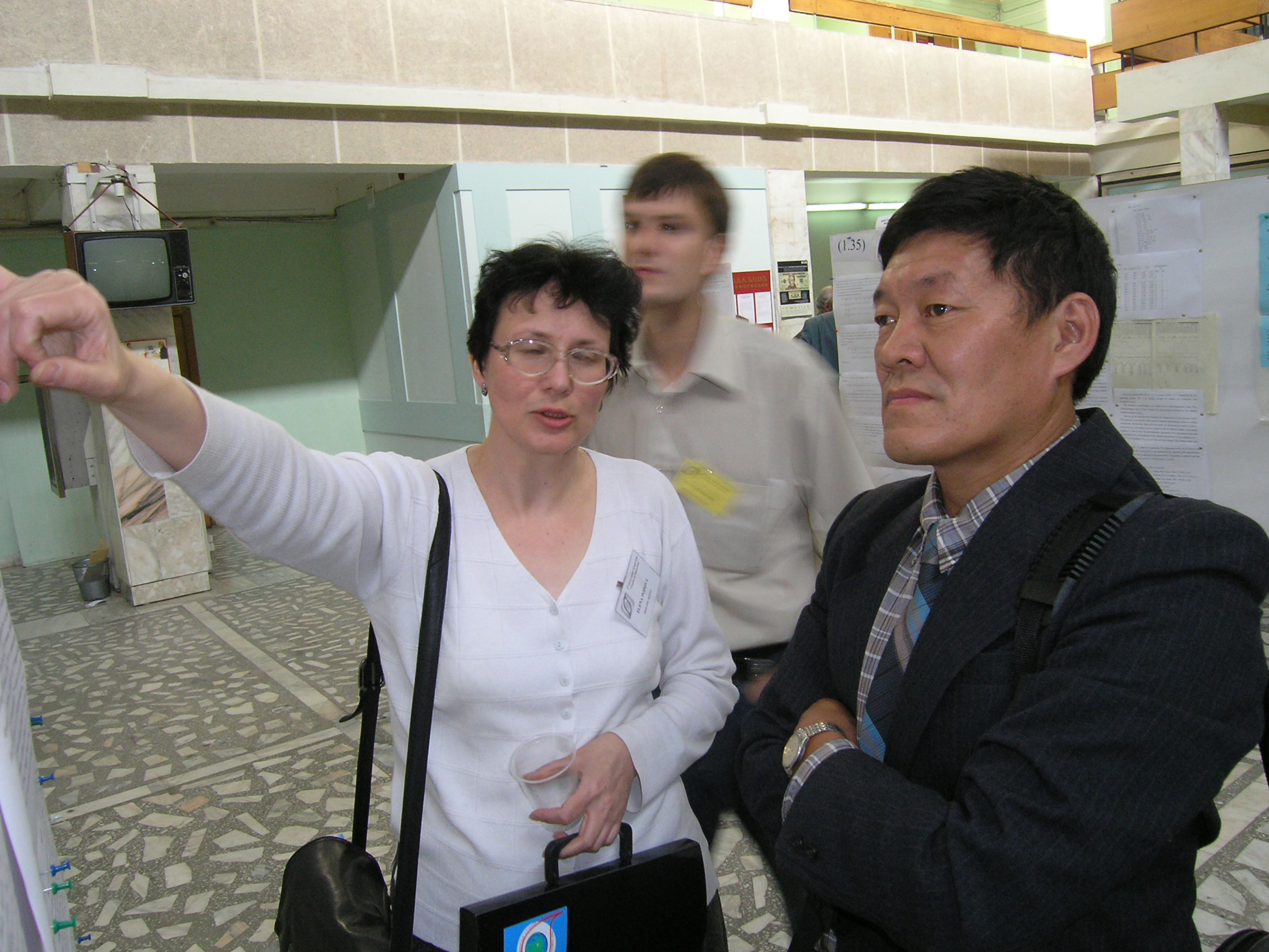 Участники Евро-Азиатского симпозиума «Прогресс в магнетизме» (ЕASTMAG-2004), организованного и проведенного Институтом физики им. Л.В. Киренского Сибирского отделения академии наук (ИФ СО РАН). у стендовых докладах симпозиума кандидат физико-математических наук Анатолий Васильевич Чжан (справа).