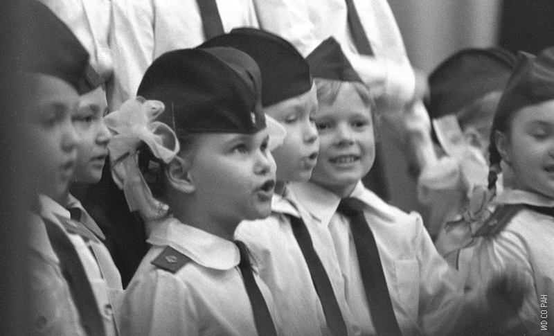Участие детской хоровой капеллы школы № 41 Академгородка, в которой пели и дети сотрудников института, в праздничном концерте, посвященном 25-летию Института физики, 1981 г.