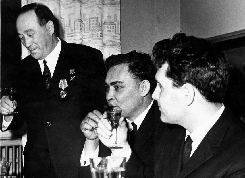 1969 год. Академику Л.В. Киренскому, организатору и первому директору Института физики Сибирского отделения Академии наук СССР (ИФ СО АН СССР), было присвоено звание Героя Социалистического Труда. После вручения Ордена Ленина и золотой медали «Серп и молот» в Москве. Слева направо: Л. В. Киренский, И.А. Терсков, заместитель директора по научной работе Института физики, Ю.В. Захаров, ученый секретарь института.