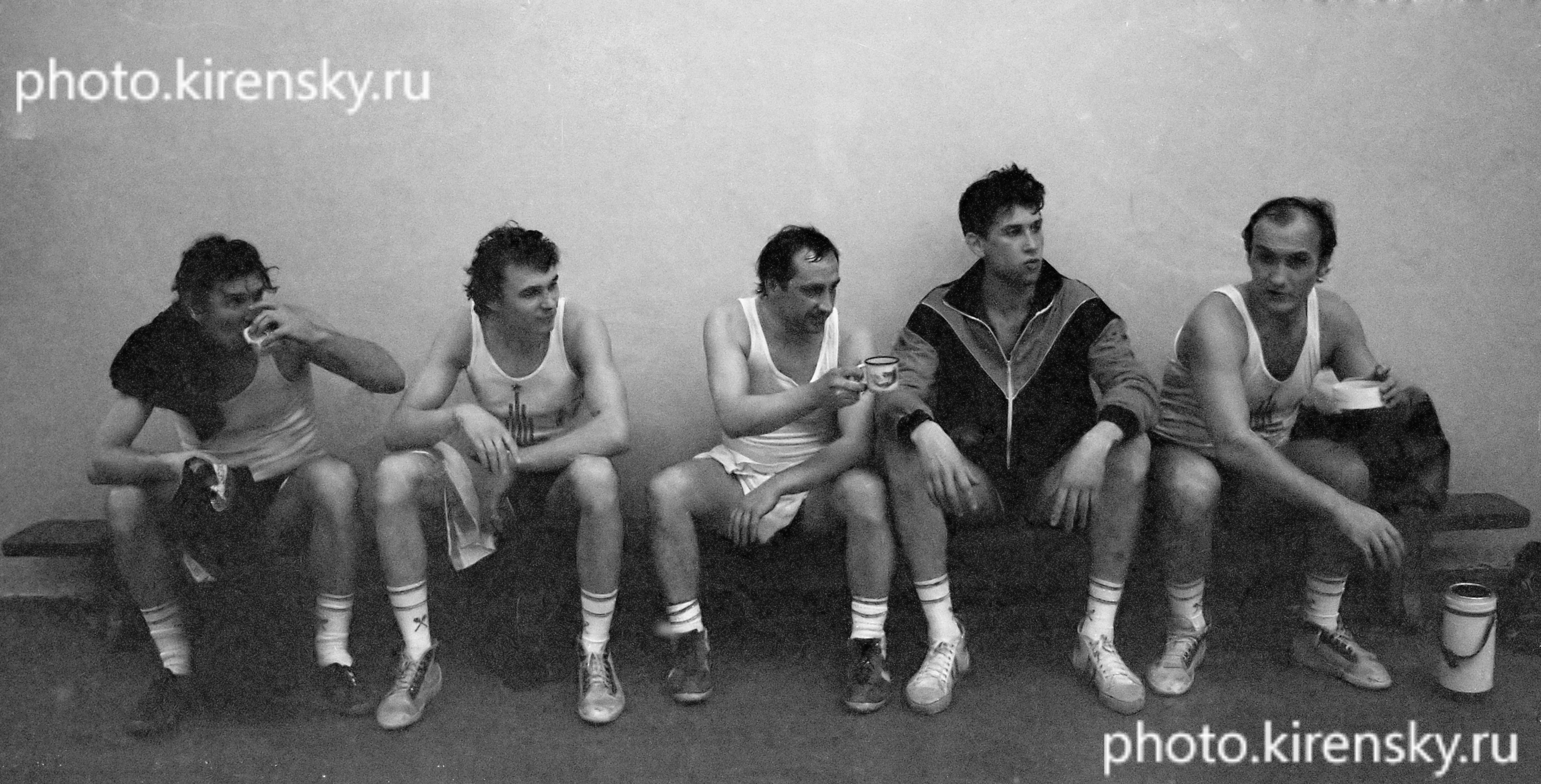 1991 год. Команда по баскетболу Института физики им. Л.В. Киренского Сибирского отделения Российской академии наук (ИФ СО РАН), слева направо: Старков А.К., Мацулев А.Н., ?, ?, Любочко В. Красноярск.