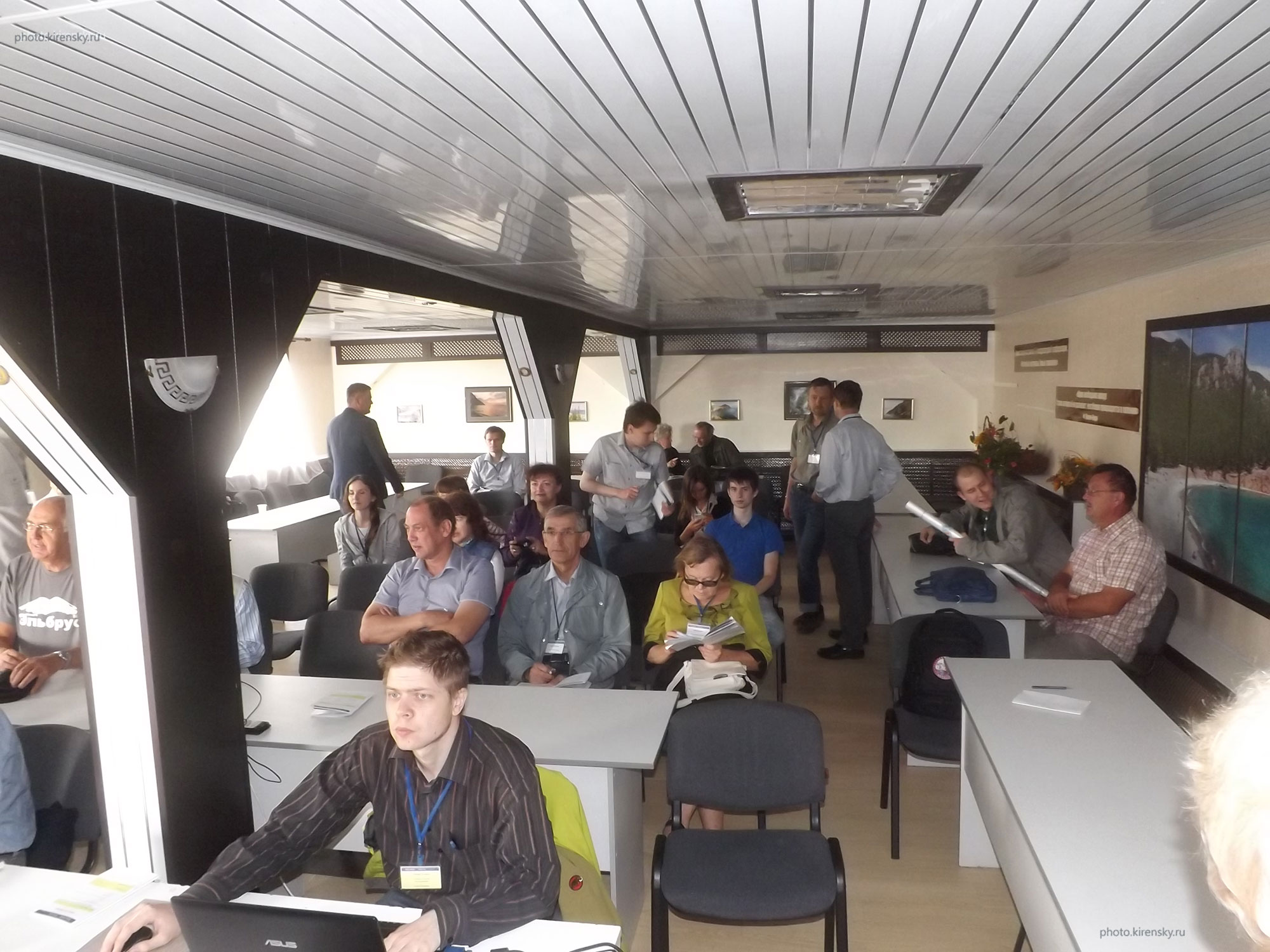 Конференция по магнетизму на озере Байкал в 2014 году. В центре снимка участник конференции (голубая майка) Соколов Валерий Владимирович, научный сотрудник лаборатории физики магнитных явлений Института физики им. Л.В. Киренского Сибирского отделения Российской академии наук.