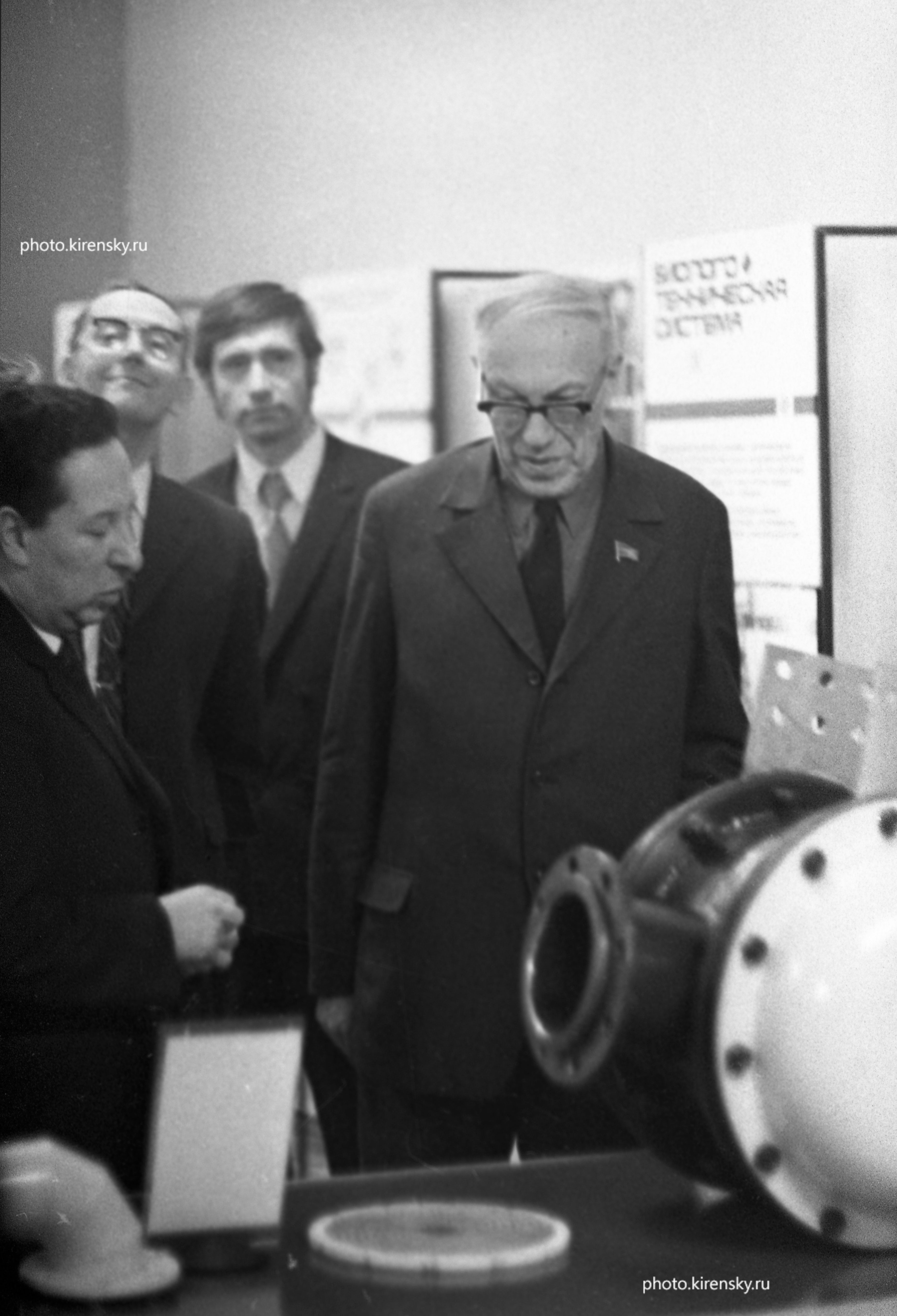 1974 год. Посещение лаборатории сильных магнитных полей Института физики им. Л.В. Киренского Сибирского отделения Академии наук СССР (ИФ СО АН СССР) председателем Президиума Сибирского отделения АН СССР академиком Лаврентьевым М.А. На снимке, слева направо: Лундин А.Г., Александров К.С., Смокотин Э.М., Лаврентьев М.А. Красноярск.