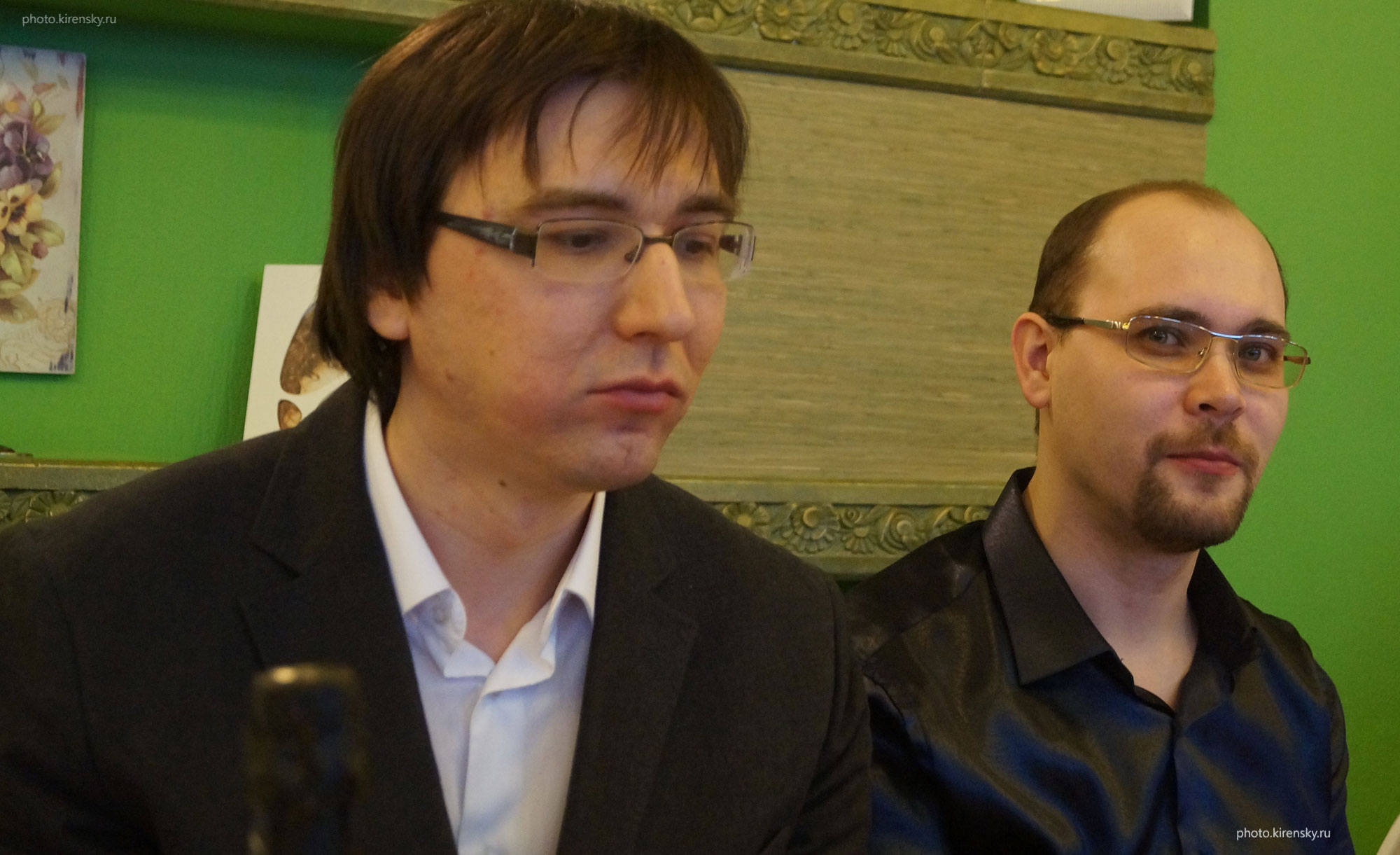 Макаров Илья Анатольевич (слева) и Петров Дмитрий Анатольевич, сотрудники лаборатории физики магнитных явлений Института физики им. Л.В. Киренского Сибирского отделения Российской академии наук в Доме ученых в Академгородке Красноярска. 2015 год