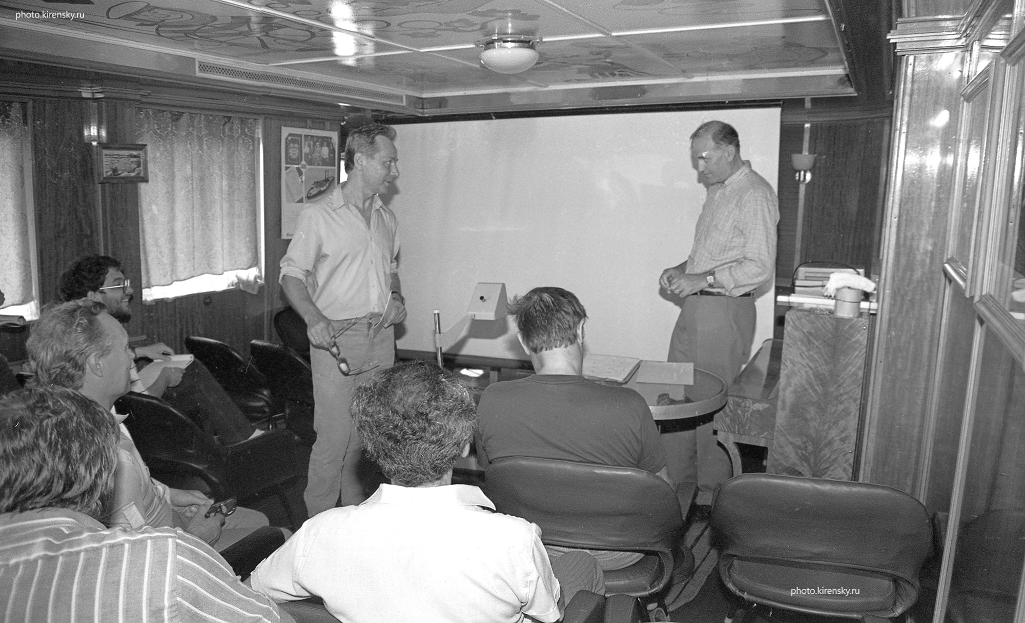 С 1 по 10 июля 1992 года на теплоходе «А. Матросов» (рейс Красноярск-Дудинка-Красноярск) проходила Международная конференция по магнитоэлектронике, организованная Институтом физики им. Л.В. Киренского Сибирского отделения Российской академии наук. На снимке момент заседания секции. Стоят: слева Петраковский Герман Антонович, доктор физико-математических наук, заведующий лабораторией резонансных свойств магнитоупорядоченных веществ Института физики.