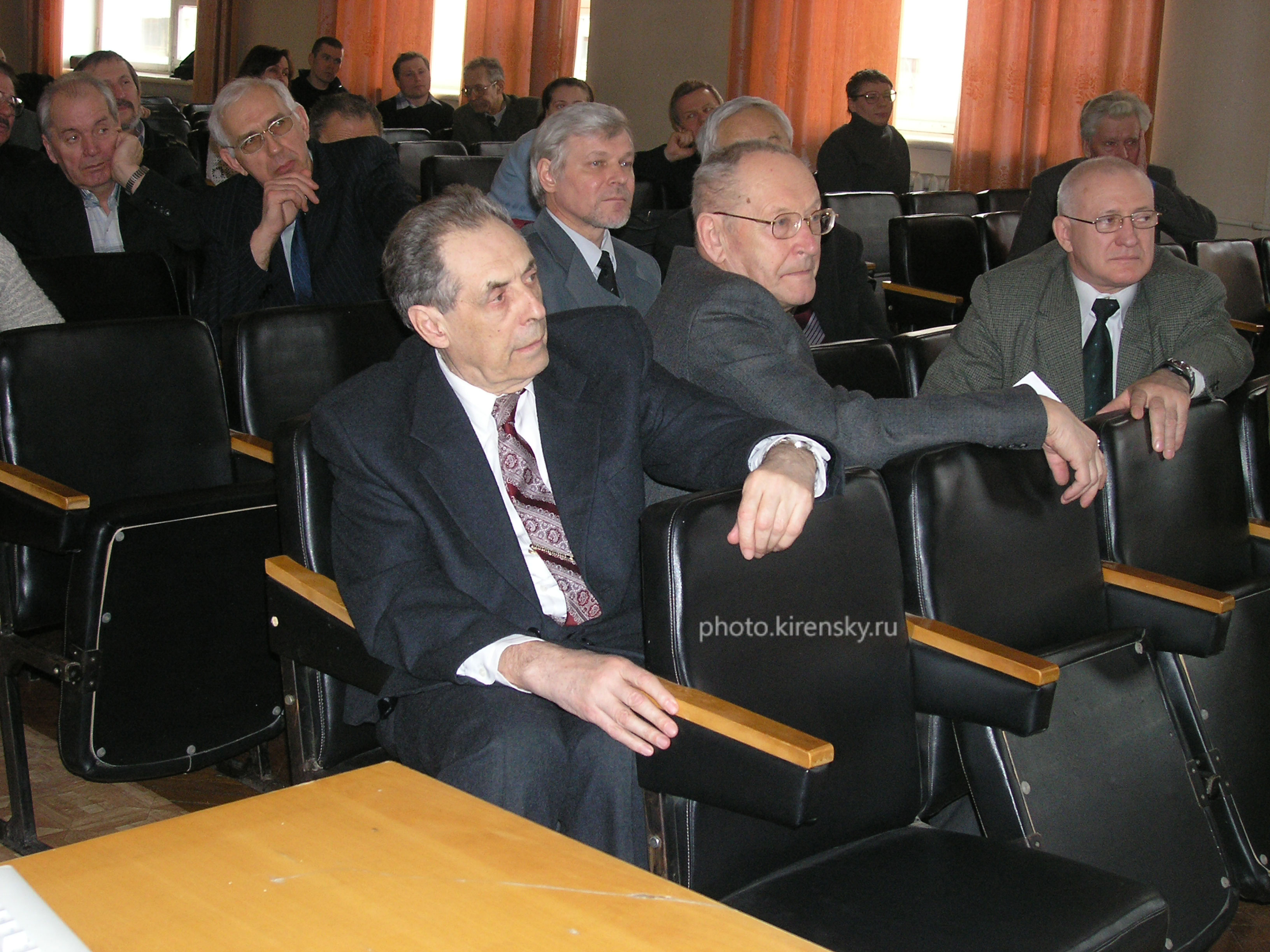 В апреле 2005 года в конференц-зале Института физики им. Л.В. Киренского Сибирского отделения Российской академии наук (ИФ СО РАН) проходили традиционные научные чтения памяти организатора и первого директора института академика Л.В. Киренского. В первом ряду (слева направо): Гительзон И.И., Александров К.С., советники РАН, Владимиров В.М., заместитель председателя Президиума Красноярского научного центра Сибирского отделения РАН. Во втором ряду Беляев Б.А., заведующий лабораторией электродинамики и СВЧ электроники. В третьем ряду, заместитель директора по научной работе Овчинников С.Г., далее Середкин В.А., старший научный сотрудник лаборатории магнитодинамики. Красноярск.