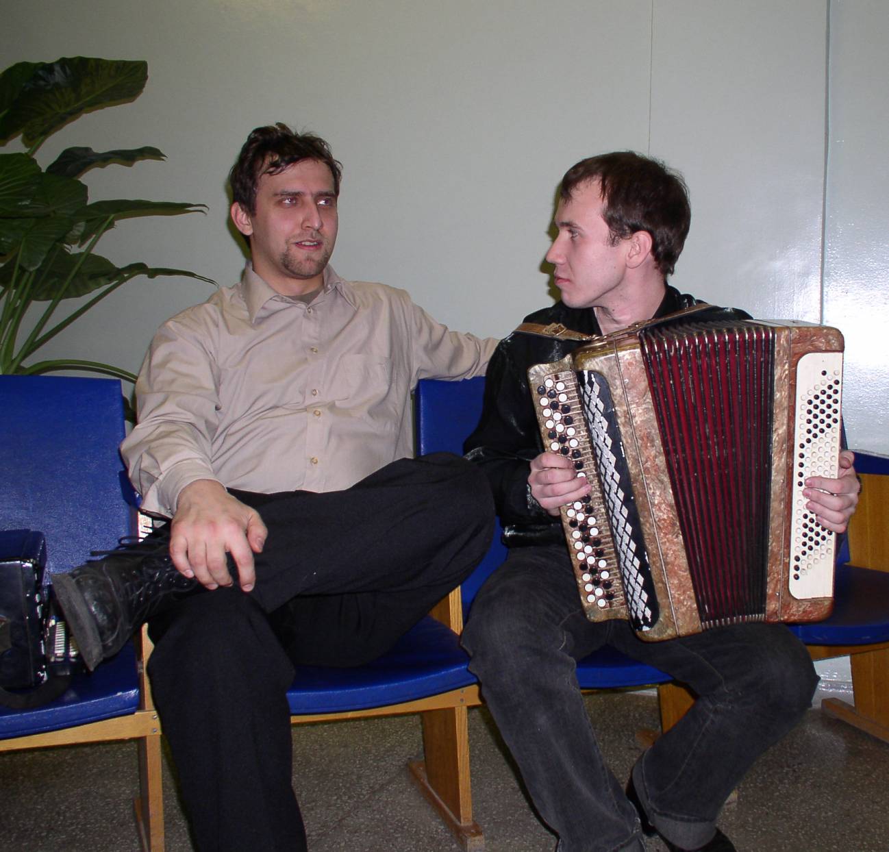 Готовимся встречать Новый 2005 год. Комогорцев Сергей Викторович (слева) и Косырев Нколай Николаевич, сотрудники Института физики им. Л.В. Киренского Сибирского отделения Российской академии наук (ИФ СО РАН), декабрь 2004 года. Красноярск.