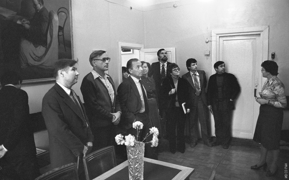 Представители Томского научного центра Сибирского отделения Академии наук СССР (ИФ СО АН СССР) вместе с сотрудниками Института физики СО АН СССР посетили музей академика Л.В. Киренского. Пояснения дает Ирина Самсоновна Эдельман, 1982 год. Красноярск.