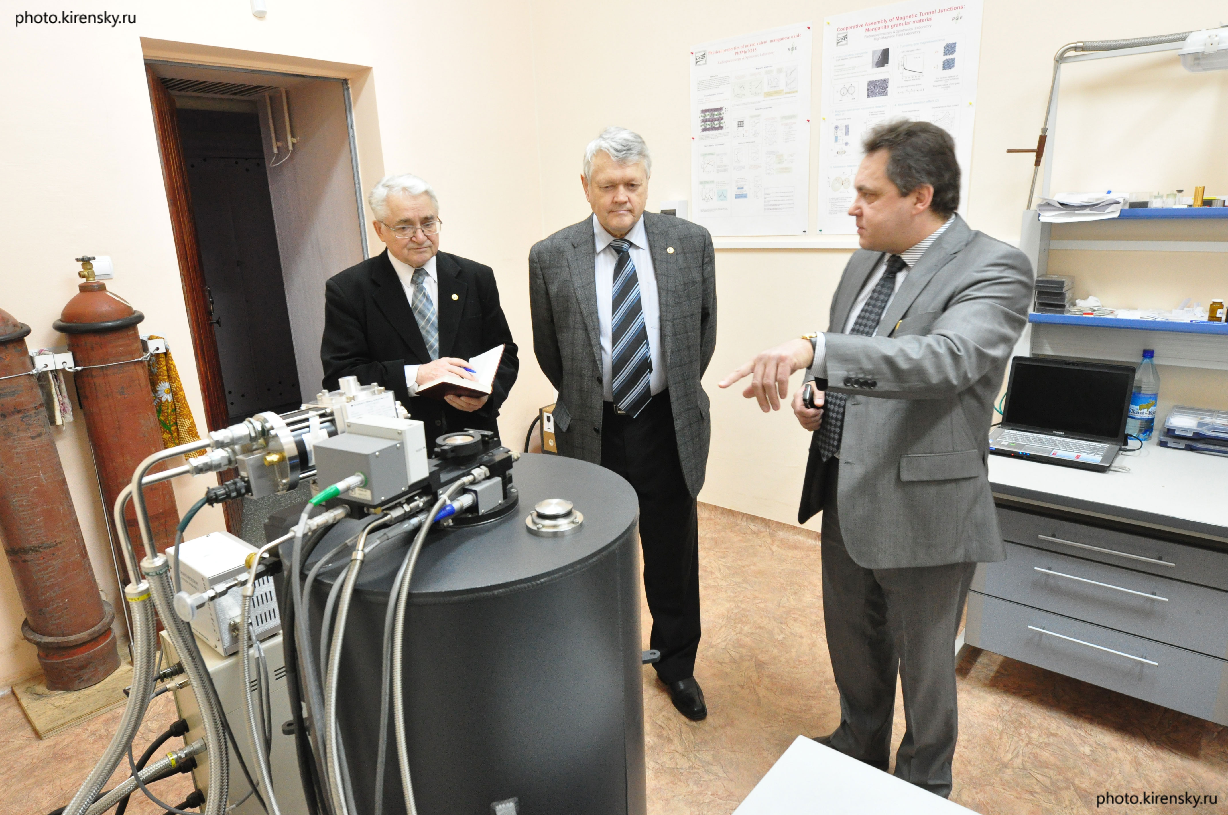 2010 год. Институт физики им. Л.В. Киренского Сибирского отделения Российской академии наук (ИФ СО РАН) посетил председатель Сибирского отделения РАН академик А.Л. Асеев. В лаборатории радиоспектроскопии и спиновой электроники. Слева направо: В.Ф. Шабанов, директор Института физики, А.Л. Асеев, Н.В. Волков, заведующий лабораторией радиоспектроскопии и спиновой электроники. Красноярск.