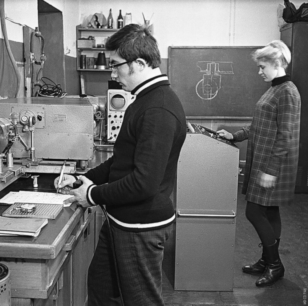 Шкедов И.М. и Зябкина С.М., сотрудники лаборатории эмиссионной спектроскопии Института физики им. Л.В. Киренского Сибирского отделения Академии наук СССР (ИФ СО АН СССР), в лаборатории. Снимок 1974 года.