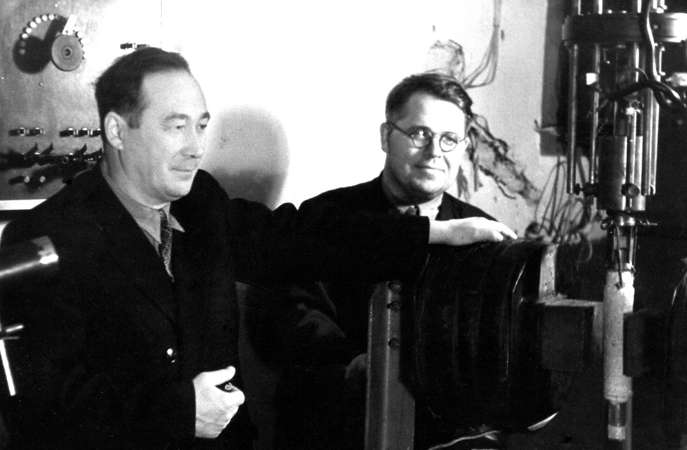 Л.В. Киренский (слева) со своими соратником Н.И. Судаковым в магнитной лаборатории, созданной Киренским в Красноярском государственном педагогическом институте во время войны в 1942 году. Фото 1956 года. Красноярск.