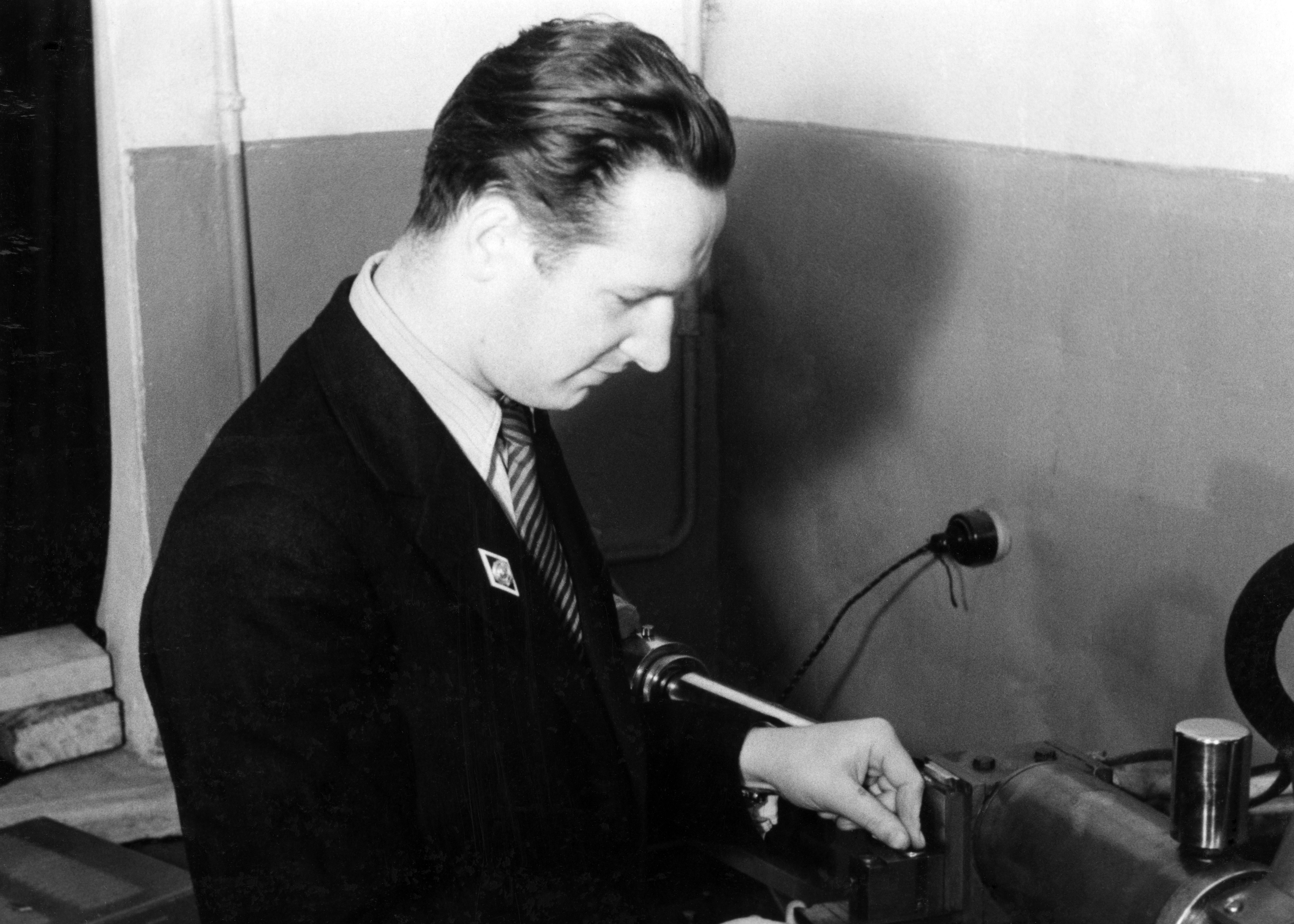 Бондаренко Г.В., младший научный сотрудник лаборатории физики магнитных явлений Института физики Сибирского отделения АН СССР, за рентгеновским спектрометром КРФС-2, фото 1962 года. Красноярск.