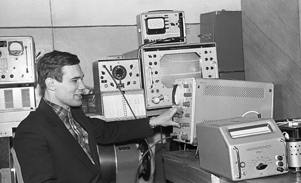 Михайловский С.С., ведущий инженер лаборатории высокочастотных и импульсных свойств тонких магнитных пленок Института физики Сибирского отделения Академии наук СССР (ИФ СО АН СССР), у собранной им установки для исследования ферромагнитного резонанса на низких частотах в перпендикулярных полях, фото1968 года. Красноярск.