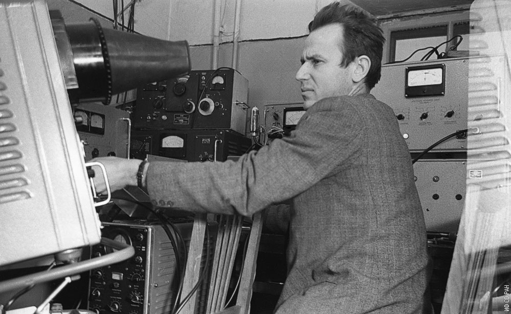 Польский А.И., младший научный сотрудник лаборатории высокочастотных и импульсных свойств тонких магнитных пленок Института физики Сибирского отделения Академии наук СССР (ИФ СО АН СССР), за установкой по исследованию тонких магнитных пленок (ТМП) в высокочастотных вращающихся полях, разработанной Анатолием Илларионовичем и изготовленной в лаборатории в 1967 году.