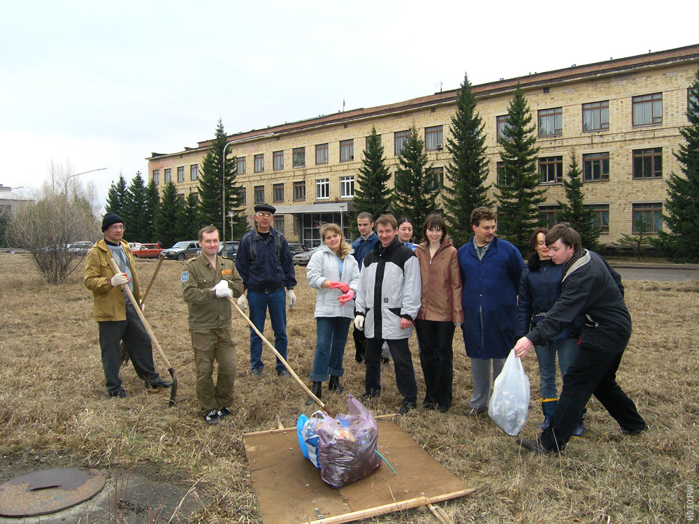 Сотрудники лаборатории физики магнитных явлений Института физики им. Л.В. Киренского Сибирского отделения Российской академии наук (ИФ СО РАН) на традиционном субботнике по уборке территории института. Слева направо: Попов Е.А., Федоров А.С., Овчинников С.Г., Харламова С. А., ?, Гавричков В.А., Шнейдер Е И., Иванова О.С.,Соколов А.Э., Лишнева Н.В., Коршунов М.М., 2004 год. Красноярск.