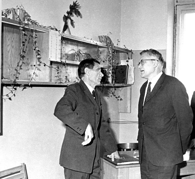 1972 год. А.Я Власов, заведующий лабораторией магнетизма горных пород и геофизики (слева) и академик В.А. Кириллин, председатель Госкомитета Совета министров СССР по науке и технике, в Институте физики им. Л.В. Киренского Сибирского отделения Академии наук СССР (ИФ СО АН СССР). Красноярск.
