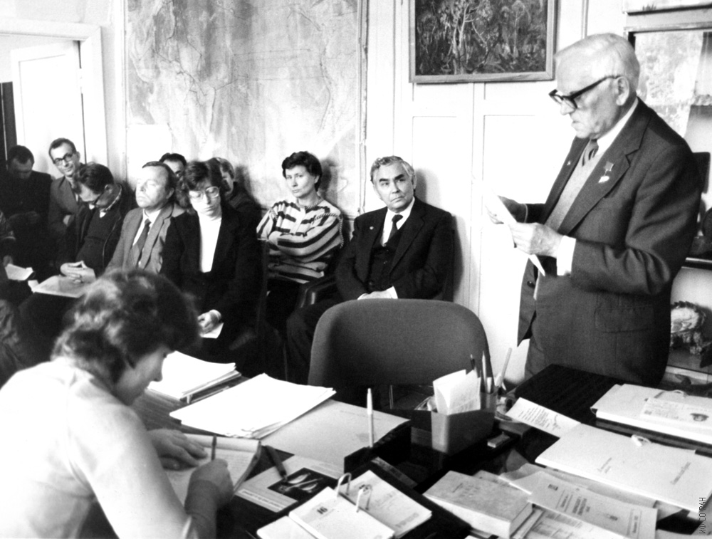 1981 год. Встреча сотрудников отдела биофизики Института физики им. Л.В. Киренского Сибирского отделения Академии наук СССР (ИФ СО АН СССР) с председателем Президиума Сибирского отделения АН СССР В.А.Коптюгом. Справа налево: директор Института физики И.А. Терсков, Э.К. Родичева, С. Медведева, А.А.Тихомиров, Н.С. Печуркин, Е.А. Ваганов, А.Г. Дегерменджи. Красноярск.