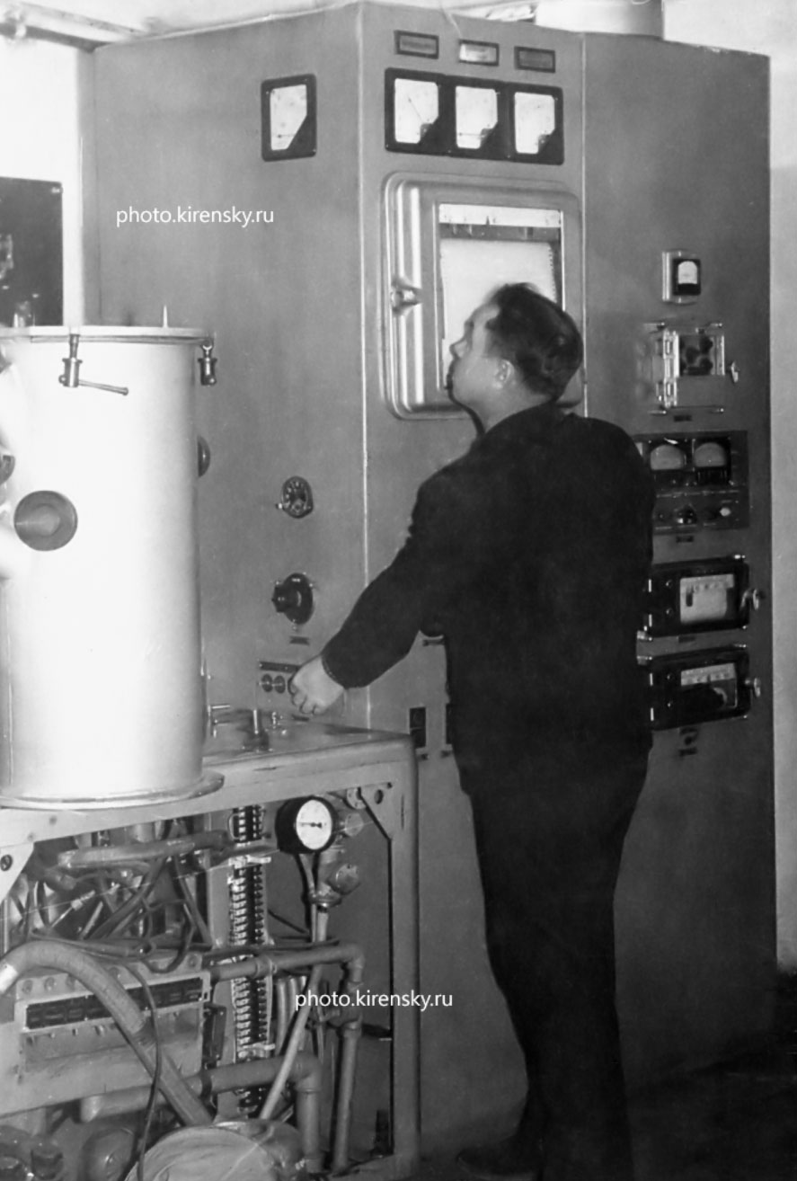 1964 год. В лаборатории магнитных материалов Института физики Сибирского отделения Академии наук СССР (ИФ СО АН СССР)(СО АН СССР с 1991 года СО РАН) занимались технологией изготовления монокристаллов ферритов. На снимке: Г.И. Зырянов у установки для выращивания монокристаллов ферритов. Красноярск.