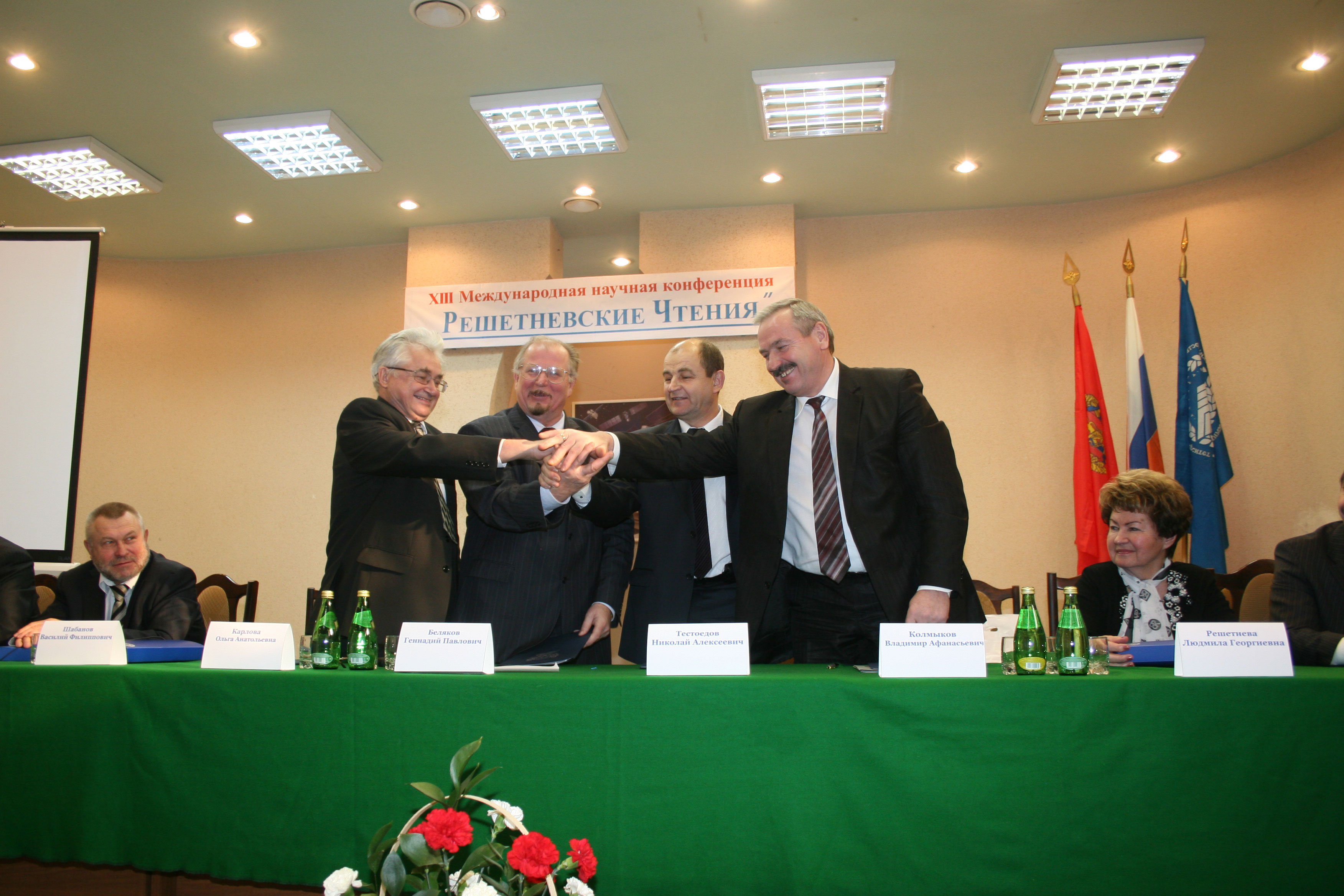 XIII Международная научная конференция «Решетневские Чтения». Подписан договор о содружестве. Слева направо: академик В.Ф. Шабанов, председатель Президиума Красноярского научного центра СО РАН, директор Института физики СО РАН, Г.П. Беляков, ректор Сибирского Аэрокосмического университета, Н.А. Тостоедов, генеральный директор, генеральный конструктор компании «Информационные спутниковые системы» им. М.Ф. Решетнева, В.А. Колмыков, директор завода «Красмаш». Сидят: Л.М. Решетнева - дочь Михаила Фёдоровича Решетнева, А.Г. Дегерменджи , директор института биофизики СО РАН. 2009 г.