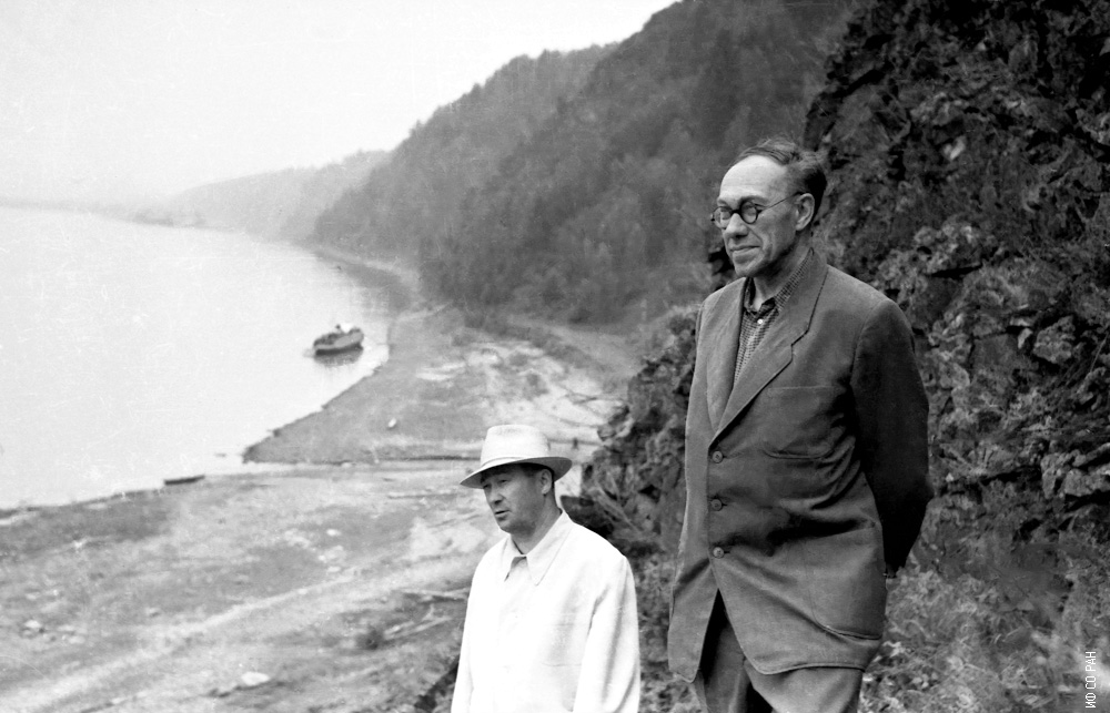 На берегу Енисея. Леонид Васильевич Киренский (слева), организатор и первый директор Института физики Сибирского отделения Академии наук СССР (ИФ СО АН СССР) и и Михаил Алексеевич Лаврентьев, председатель Президиума Сибирского отделения наук СССР. В этом году комиссия Сибирского отделения во главе с М.А. Лаврентьевым принимала решение о месте строительства Академгородка в Красноярске.
