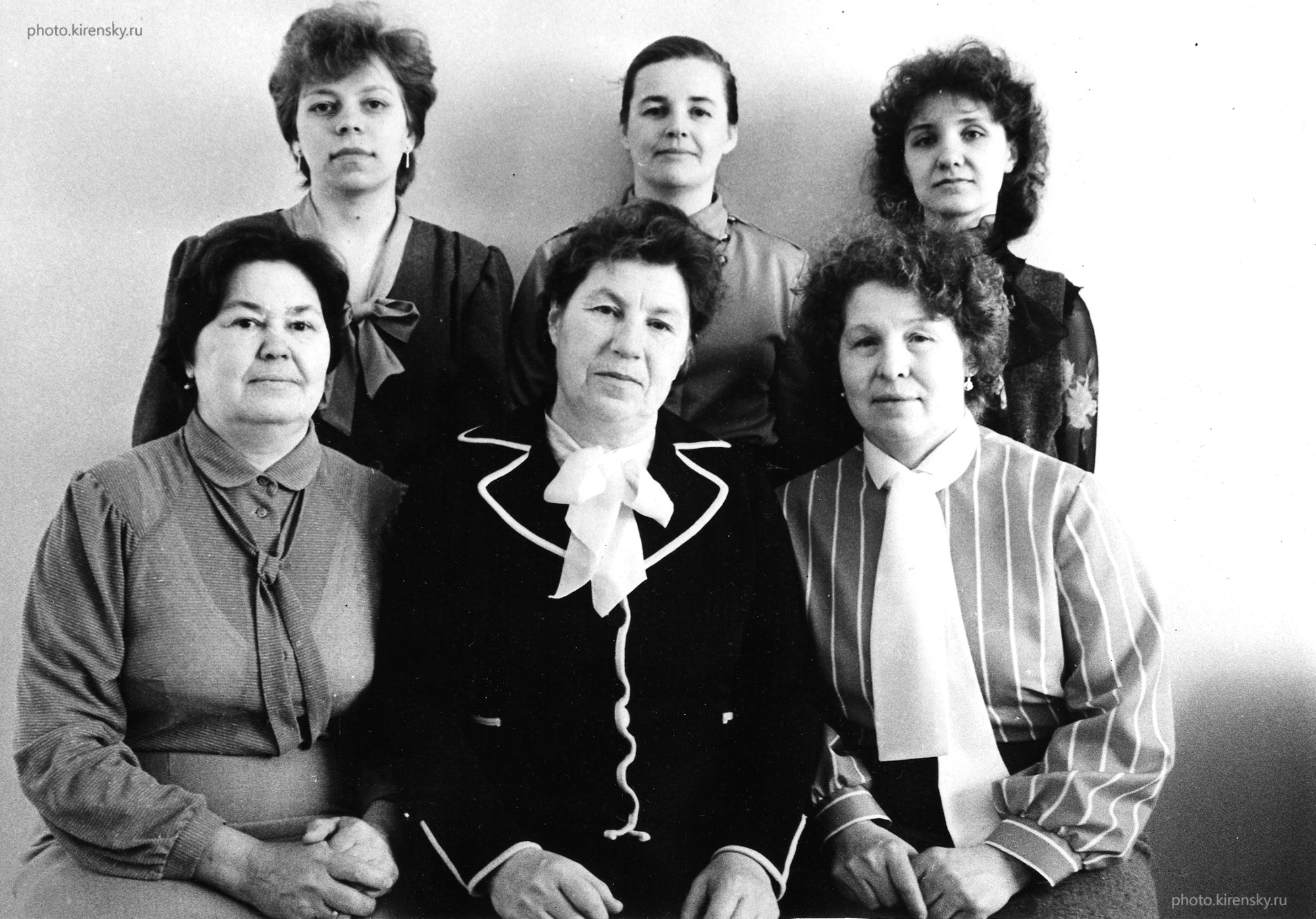 Сотрудники библиотеки Института физики им. Л. В. Киренского Сибирского отделения Российской академии наук. Сидят, слева направо: И. М. Южакова, Г. А. Шугинина, заведующая библиотекой, Р. А. Андреева. Во втором ряду: Татьяна Попова, О. В. Блохина, Е. Б. Мамаева. Снимок 1992 года. Красноярск.