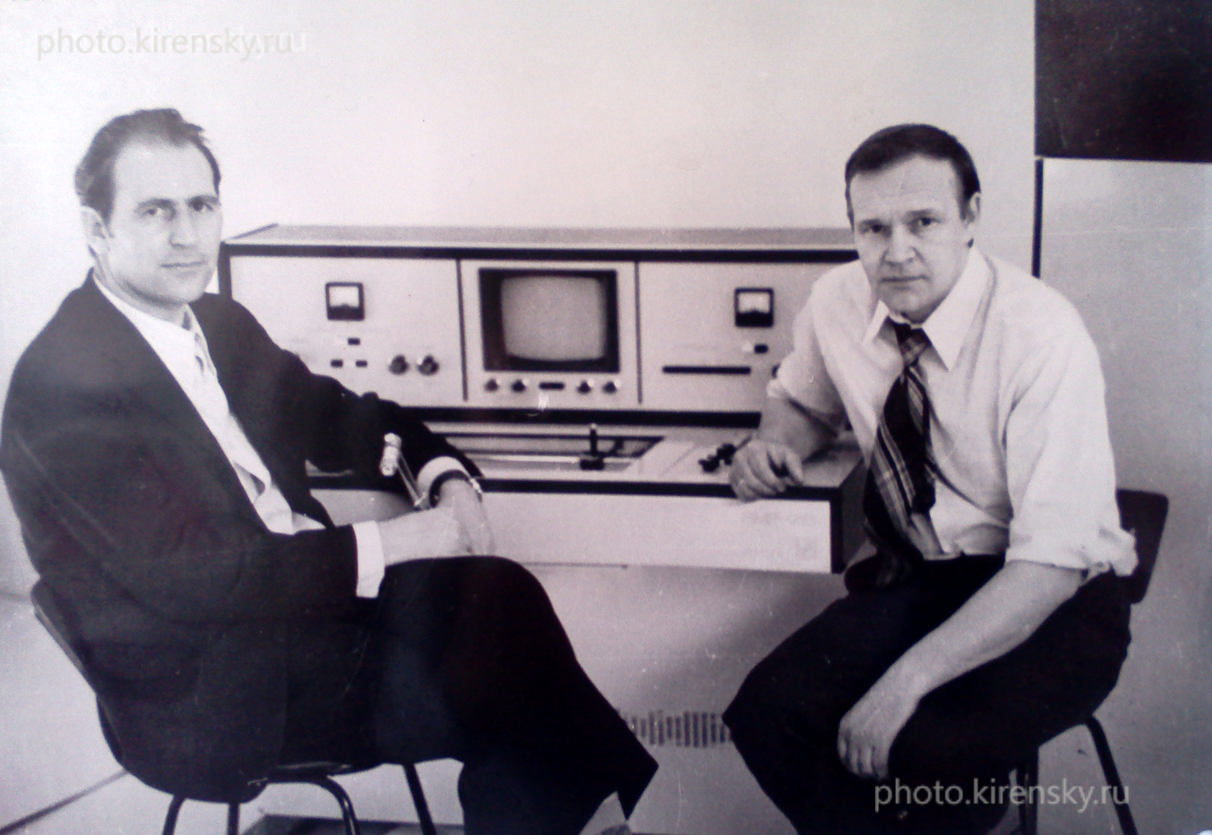 1974 год. На снимке Эвальд Петрович Зеер, старший научный сотрудник лаборатории радио-спектроскопического структурного анализа (РСА) Института физики им. Л.В. Киренского Сибирского отделения Академии наук СССР (слева) и Вячеслав Александрович Бабаев рядом с пультом управления ЯМР спектрометра со сверхпроводящим соленоидом. Спектрометр был разработан под руководством Зеера в лаборатории (РСА), дизайн установки осуществлен Бабаевым. Изготовлен спектрометр в экспериментальных механических мастерских института и собран в лаборатории. Красноярск.
