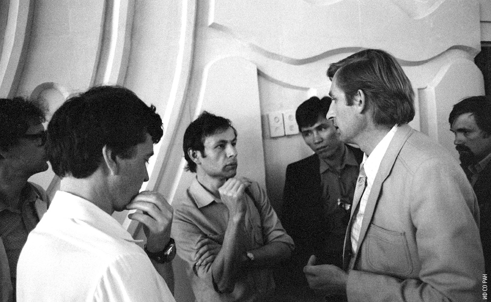 Красиков В.С. (второй слева), Бабкин Е.В. (напротив Красикова) на семинаре по функциональной магнетоэлектронике в г. Дивногорске, организованном лабораторией резонансных свойств магнитоупорядоченных веществ Института физики им. Л.В. Киренского Сибирского отделения АН СССР (заведующий лабораторией Г.А. Петраковский) в 1986 году.