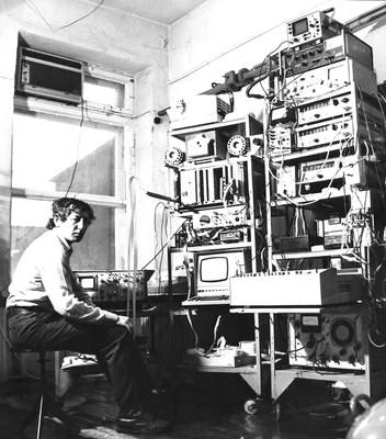 В лаборатории сильных магнитных полей Института физики им. Л.В. Киренского Сибирского отделения АН СССР велись работы по созданию установок стационарных и импульсных магнитных полей, разрабатывались методы измерений в сильных магнитных полях, велись исследования свойств магнитных материалов в таких полях. На снимке:1985 год. Бояршинов Ю.В., ведущий инженер лаборатории, у автоматизированного магнетометра со сверхпроводящим соленоидом (до 8 Т) для измерения магнитных свойств ферро- антиферро- и диамагнитных веществ. Красноярск.