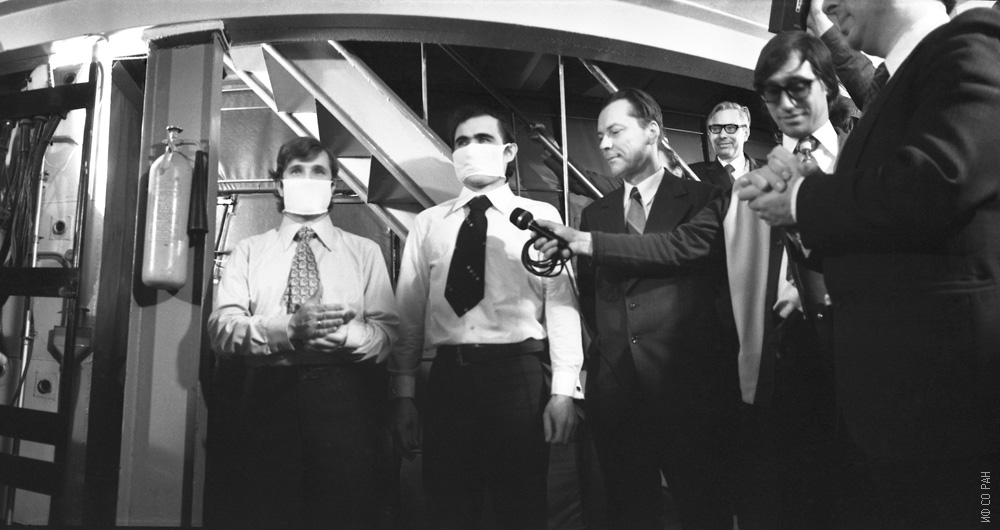 1973 год. Отделом биофизики Института физики им. Л.В. Киренского Сибирского отделения Академии наук СССР (ИФ СО АН СССР) подготовлен и проведен шестимесячный эксперимент на установке "Биос-3" (космическая программа института), в ходе которого экипаж был полностью обеспечен кислородом, водой и на 30% пищевыми веществами за счет интенсивного биосинтеза специального набора зерновых и овощных культур, выращиваемых в ходе эксперимента на "борту" установки. Момент выхода «экипажа». Слева направо: Николай Иванович Бугреев и Геннадий Захирович Асиньяров . Их встречают: Юлий Николаевич Окладников (с микрофоном), Федор Яковлевич Сидько (за спиной Окладникова). Красноярск.