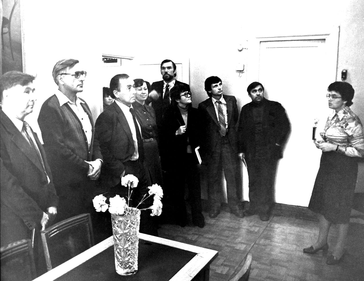 Гости из Томского научного центра в мемориальном музее организатора и первого директора Института физики Сибирского отделения Академии наук СССР академика Леонида Васильевича Киренского. Рассказывает Эдельман И.С. Второй справа Бузник В.М., четвертый справа Чистяков Н.С. Снимок 1982 года. Красноярск.