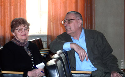 Супруги: Эдельман Ирина Самсоновна, заведующая лабораторией физики магнитных явлений и Игнатченко Вальтер Алексеевич, заведующий теоретическим отделом и лабораторией теоретической физики Института физики им. Л.В. Киренского Сибирского отделения Академии наук СССР (ИФ СО АН СССР), на общеинститутском физическом семинаре. Снимок 1990 года. Красноярск.