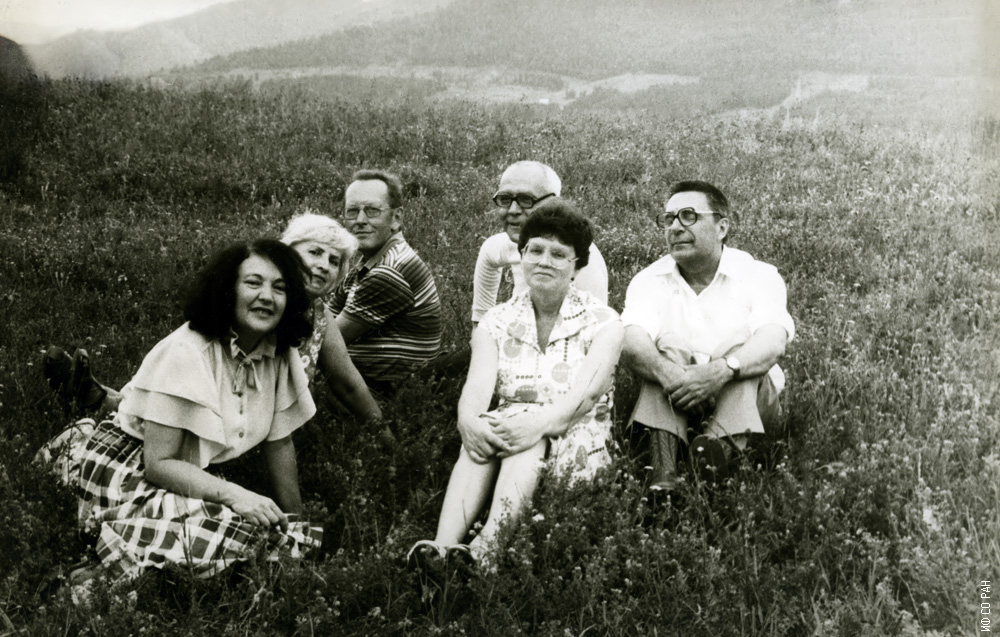 1983 год. На отдыхе – друзья и коллеги. Слева направо: Александрова Инга Петровна, Калинина Мария Михайловна, Александров Кирилл Сергеевич, Калинин Юрий Дмитриевич, Эдельман Ирина Самсоновна, Игнатченко Вальтер Алексеевич, сотрудники Института физики им. Л.В. Киренского Сибирского отделения Академии наук СССР (СО АН СССР с 1991 года - СО РАН). Красноярск.