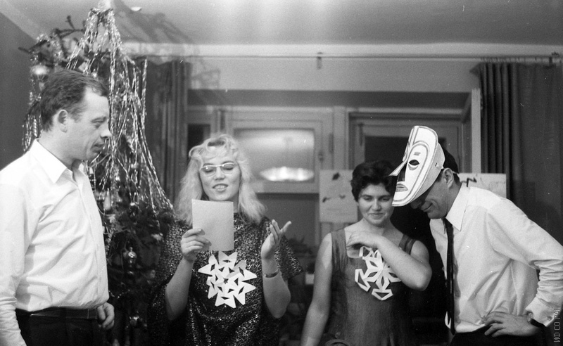 На вечере встречи Нового 1966 года еще в старом здании Института физики им. Л.В. Киренского Сибирского отделения Академии наук СССР (ИФ СО АН СССР) по проспекту К. Маркса, 42, две супружеские пары сотрудников института (слева направо): Звегинцев А.Г., Звегинцева Л. Н., Эдельман И.С., Игнатченко В.А. Красноярск.