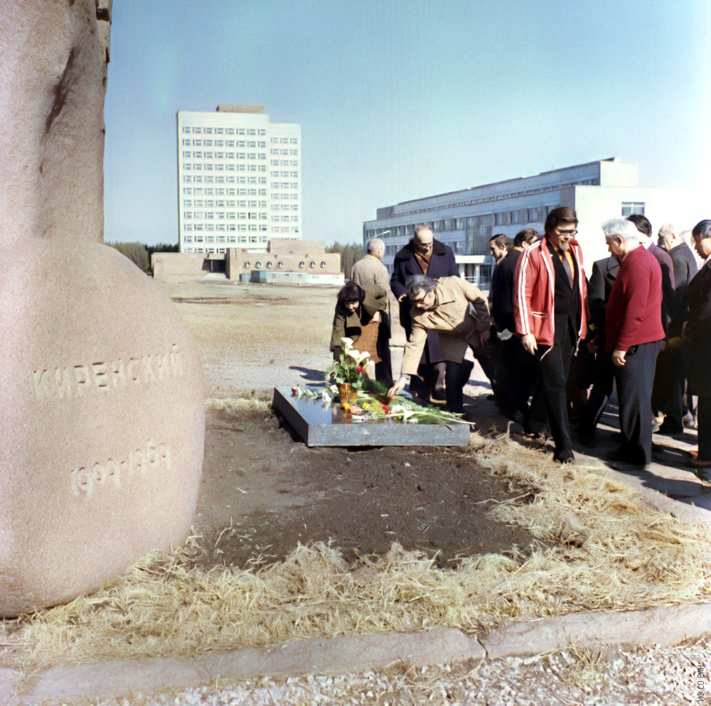 7 апреля 1985 года. В Институте физики им. Л.В. Киренского Сибирского отделения Академии наук СССР (ИФ СО АН СССР) прошли ежегодные научные чтения памяти академика Л.В. Киренского, организатора и первого директора института. После чтений традиционное возложение цветов на могиле Леонида Васильевича в день его рождения 7 апреля. Он похоронен на территории организованного им института в Академгородке Красноярска. Слева направо: Александрова И. П., Коршунов А. В., Жигалов В.С., Кузьмин Е.В., Ершов Р.Е.