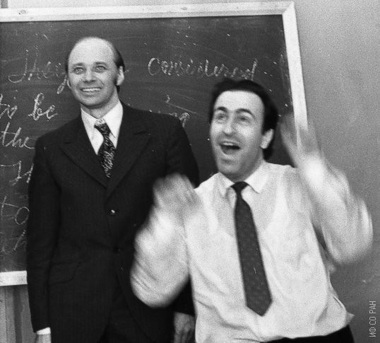 1975 год. Смолин Р.П. (слева) и Фиш А.М, сотрудники Института физики им. Л.В. Киренского Сибирского отделения Академии наук СССР (ИФ СО АН СССР), на уроке английского языка (кафедра иностранных языков, организована была в Институте физики для ускоренного обучения языка). Красноярск.