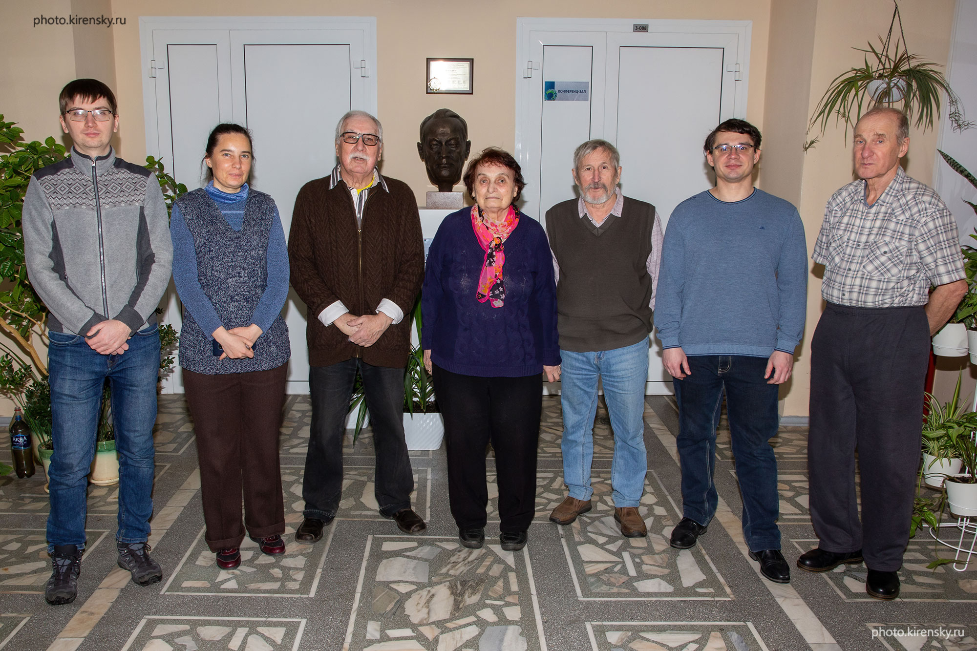 Лаборатория физики магнитных плёнок. Слева направо: Ярославцев Роман Николаевич, окончил Сибирский федеральный университет, кандидат технических наук с 2017 года (диссертация «Получение, структура, статистические и динамические магнитные свойства наночастиц ферригидрита и их модификация термоотжигом, легированием и ультразвуковой обработкой», научные руководители Р.С. Исхаков, С.В. Столяр), Важенина Ирина Георгиевна, окончила Иркутский государственный университет путей сообщения, кандидат физико-математических наук с 2015 года (диссертация «Развитие метода спин-волновой спектроскопии для исследования магнитных неоднородностей нанокристаллических, мультислойных и градиентных плёнок Fe-Ni, Co-Ni и Co-P”, научный руководитель Р.С. Исхаков), Исхаков Рауф Садыкович, окончил Красноярский государственный университет, доктор физико-математических наук с 1990 года (диссертация «Исследование неоднородностей строения аморфных сплавов магнитоструктурными методами»), Чеканова Лидия Александровна, окончила Ставропольский государственный педагогический институт, кандидат физико-математических наук с 1980 года (диссертация «Спин-волновой резонанс и структурные превращения в аморфных Co-D пленках», научные руководители Р.Г. Хлебопрос, Н.С. Чистяков), Жигалов Виктор Степанович, окончил Красноярский государственный политехнический институт, доктор физико-математических наук с 2004 года (диссертация «Особенности структуры, фазовых состояний и магнитных свойств нанокристаллических композиционных пленок 3d-металлов, полученных сверхбыстрой конденсацией»), Мацынин Алексей Александрович, окончил Сибирский государственный аэрокосмический университет, кандидат физико-математических наук с 2014 года (диссертация «Фазовые, структурные и магнитные превращения в пленочных системах Fe/Mn и Mn/Ge при вакуумном отжиге», научный руководитель В.Г. Мягков»), Мягков Виталий Григорьевич, окончил Красноярский государственный педагогический институт, доктор физико-математических наук с 2008 года (диссертация «Структурные превращения и химические взаимодействия в двухслойных металлических нанопленках»). Фото 2022 года.