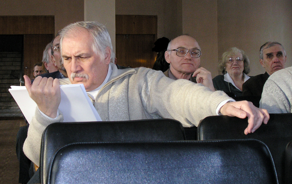 1993 год. Актовый зал Института физики им. Л.В. Киренского Сибирского отделения Российской академии наук (ИФ СО РАН). Заседание диссертационного совета. Вопрос задает Петраковский Г.А. Во втором ряду, крайний слева - Зиненко В.И., ведущий научный сотрудник лаборатории кристаллофизики ИФ. Красноярск.