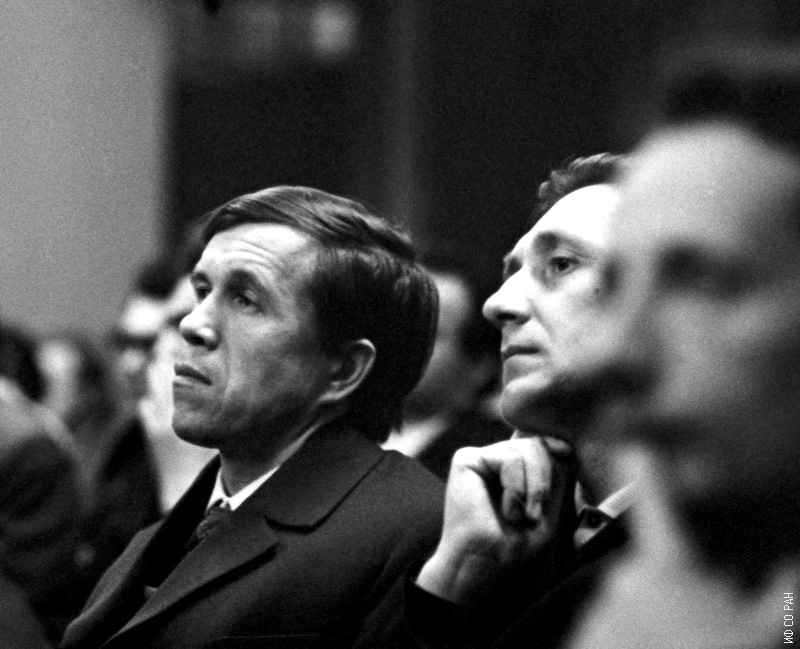 Кочаров Н. Г. (слева) и Катрухин Ю. К., сотрудники лаборатории сильных магнитных полей Института физики им. Л.В. Киренского Сибирского отделения Академии наук СССР (ИФ СО АН СССР), в конференц-зале института на общеинститутском методологическом семинаре, фото октября 1978 года. Красноярск.