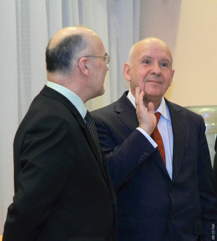 Корец А.Я. (слева), Ответственный секретарь Центральной приемной комиссии Сибирского федерального университета (СФУ) и Подопригора В.Г., проректор Красноярского государственного торгово-экономического института, на семинаре отдела оптики Института физики им. Л.В. Киренского Российской академии наук (ИФ СО РАН), посвящённом 100- летнему юбилею Коршунова А.В., организатора и руководителя отдела оптики института. Академгородок Красноярска, Дом ученых, 13 января 2011 года