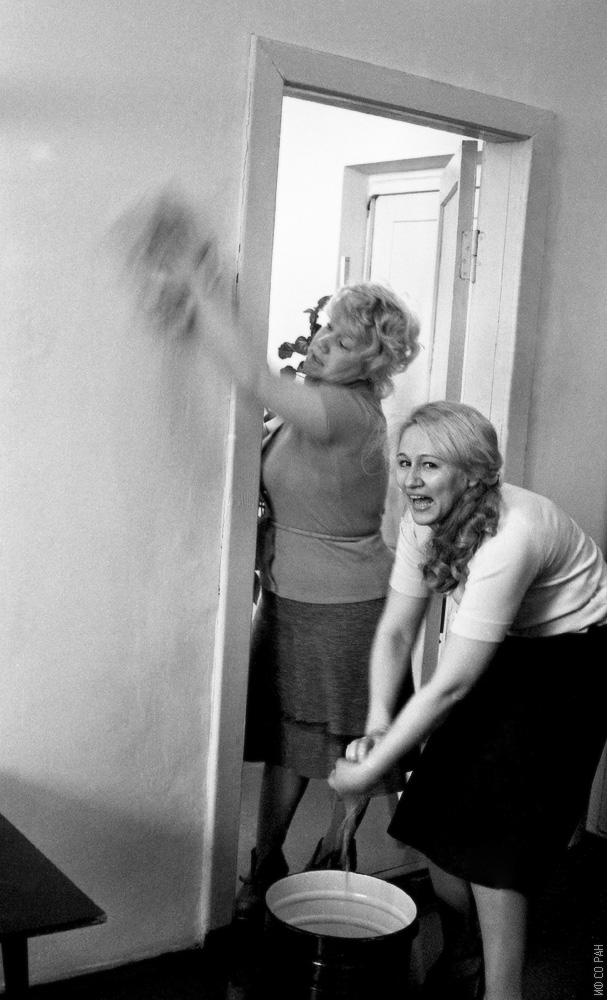 В день субботника по гереральной уборке рабочих мест в Институте физики им. Л.В. Киренского Сибирского отделения Академии наук СССР (ИФ СО АН СССР). На фото Королева Светлана Тимофеевна (слева) и Касапенко Анна, сотрудницы планового отдела института. Снимок 1985 года.