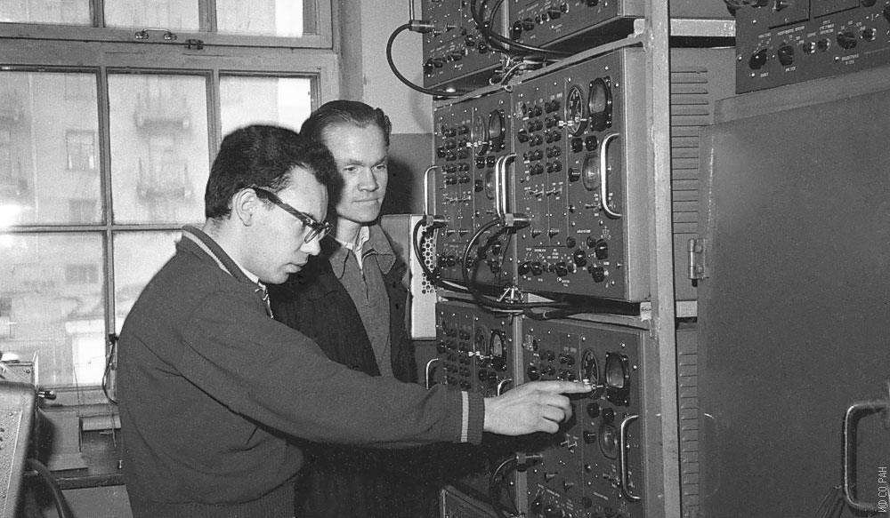 Заведующий лабораторией высокочастотных и импульсных свойств тонких магнитных пленок (ВИС ТМП) Института физики Сибирского отделения Академии наук СССР (ИФ СО АН СССР) Саланский Н. М. (слева) и инженер Кузнецов Н. Ф. у одной из установок в лаборатории, фото 1968 года. Красноярск.
