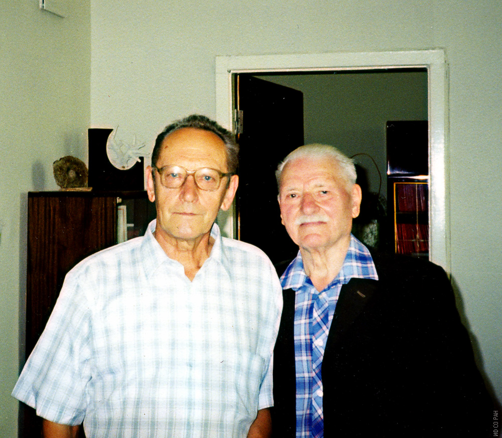 1998 год. Академик Александров К. С. (слева), директор Института физики им. Л.В. Киренского Сибирского отделения Российской академии наук (ИФ СО РАН) с Кузнецовым В. Е., первым ученым секретарем института, во время посещения им Красноярска.