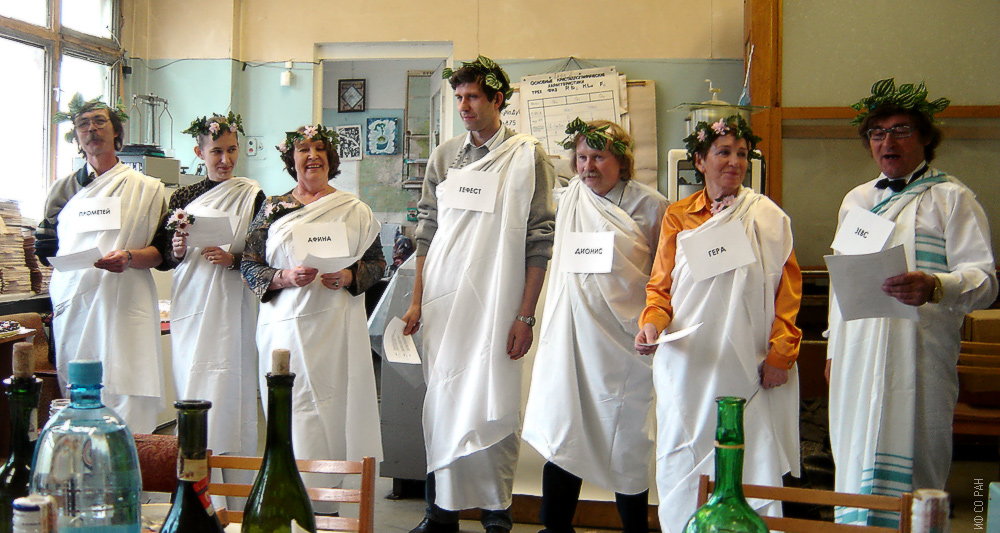 Физики шутят. Сотрудники лаборатории кристаллофизики Института физики им. Л.В. Киренского Сибирского отделения Российской академии наук (ИФ СО РАН) поздравляют с 60-летием Игоря Николаевича Флерова. Слева направо: Мельникова С.В., Воронов В.Н., Гранкина В.А., Зайцев А.И., Давыдова Т.Н, Бовина А.Ф. Фото 2002 года. Красноярск.