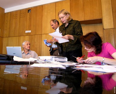 В комнате оргкомитета Международной конференции "NATO Advanced Research Workshop Smart Materials for Ranging Systems (Современные материалы для применения в качестве датчиков)». Cлева направо, сотрудники Института физики им. Л.В. Киренского Сибирского отделения Российской академии наук (ИФ СО РАН), Панкрац Анатолий Иванович, Воротынов Александр Михайлович, Романова Оксана Борисовна, Удод Любовь Викторовна. Август 2004 года. Красноярск.